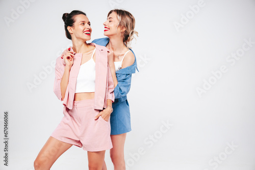 Two young beautiful smiling brunette hipster female in trendy summer clothes. Sexy carefree women posing on white background in studio. Positive models having fun. Cheerful and happy. Isolated