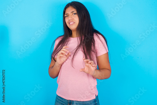 Ugh how disgusting! Displeased Young hispanic girl wearing pink T-shirt over blue background , has dissatisfied facial expression as sees something abominable.