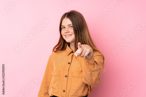 Ukrainian teenager girl over isolated pink background points finger at you with a confident expression