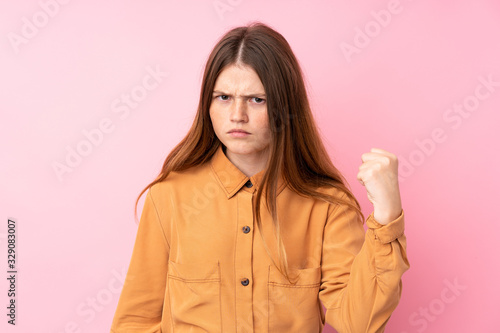 Ukrainian teenager girl over isolated pink background with angry gesture