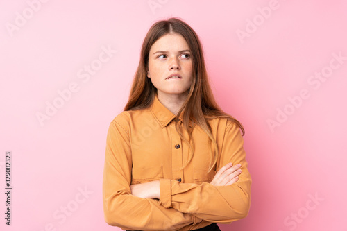 Ukrainian teenager girl over isolated pink background with confuse face expression