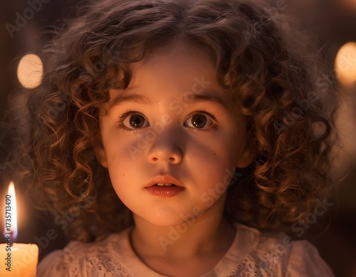 Ultra-realistic artistic close-up of a 3-year-old girl with soft curly hair lit by warm candlelight