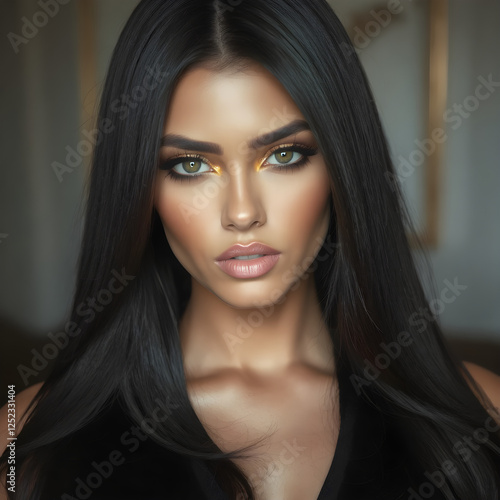 Un look impecable en una modelo cuya belleza resalta con maquillaje refinado.