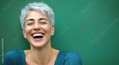 Une femme senior âgée de cinquante ans aux cheveux argentés courts, riant et vêtue de bleu sur fond vert, image avec espace pour texte.