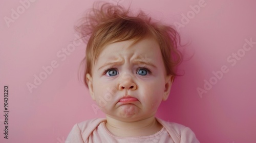 Unhappy and dissatisfied toddler baby isolated on a pink studio background. Crying kid or child showing frustration and negative
