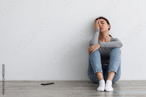 Unhappy caucasian female touching face, sits on floor at home, thinks about problems, upset lady feeling lonely