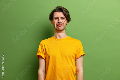 Unhappy handsome Caucasian man cries out in despair feels desperate smirks face wears caual yellow t shirt has melancholic face expression suffers from stress isolated over green background.