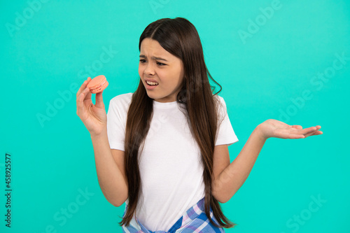unhappy kid hold french macaron or macaroon cookies, copy space, confectionary