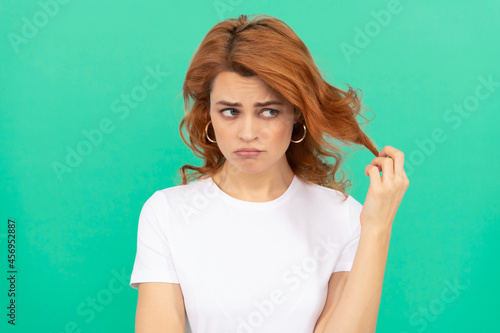unhappy redhead woman with curly hair on blue background, disappointment