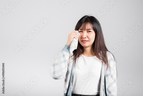 Unhappy woman bad mood her cry wipe mucus with tissue, beautiful young female stress feel sneezing sinus use towel to wipe tear from eyes, studio shot isolated on white background with copy space