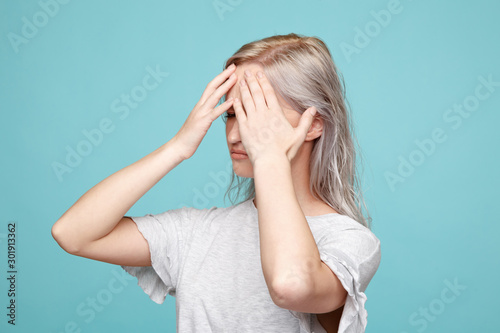 Unhappy young lady in stress with headache holding her head by hand isolated in the blue studio