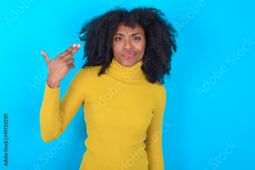Unhappy Young woman with afro hairstyle wearing yellow turtleneck over blue background makes suicide gesture and imitates gun with hand, curves lips, keeps two fingers on temple