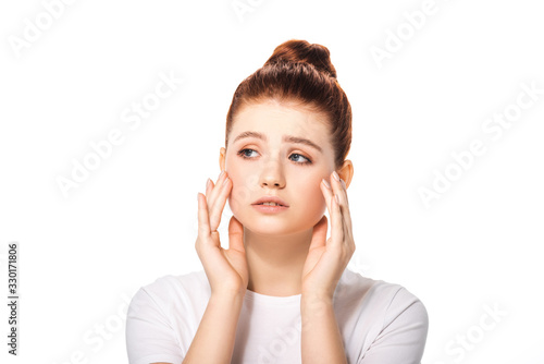 upset beautiful female teenager touching face, isolated on white