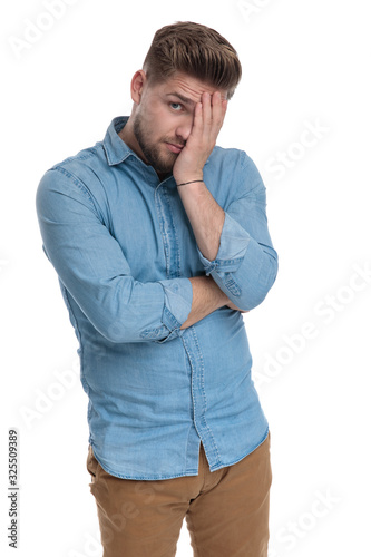Upset casual man holding covering his face with his hand