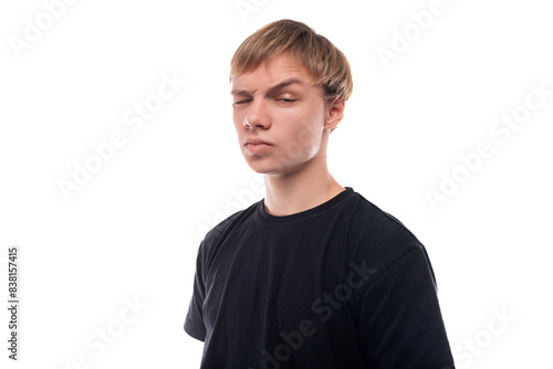 Upset fair-haired teenager guy in a black T-shirt on a white background