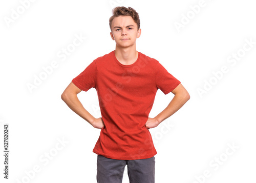 Upset handsome caucasian Teen Boy with hands on waist, isolated on white background. Angery teenager looking at camera. Unhappy child portrait.