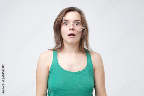 Upset handsome woman tired of wearing glasses. Sad young femalr failing in putting on eyeglasses. Tired student after night of preparation for exam.