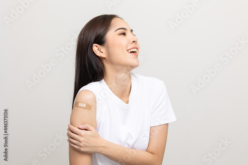 Vaccination. Young beautiful asian woman getting a vaccine protection the coronavirus. Smiling happy female showing arm with bandage after receiving vaccination. On isolated white background.