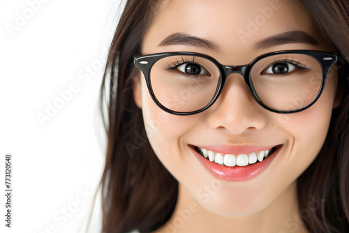 Closeup portrait of smiling beautiful Asian woman wearing glasses isolated on white background,