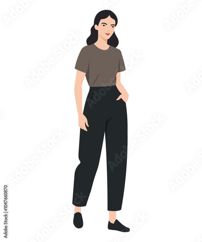 Vector illustration of a girl in casual clothes gray t-shirt and black pants. Simplicity and comfort.