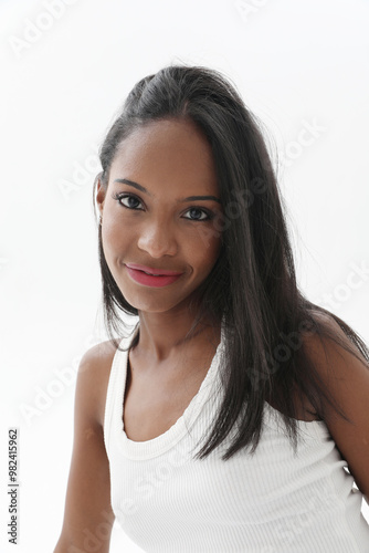 Vertical headshot of young optimistic woman with dark skin posing over white background.