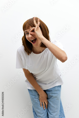 vertical photo of a funny, cute woman showing an ok sign near her eye while leaning towards the camera