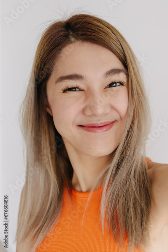 Vertical photo of playful asian woman taking selfie isolated on white.