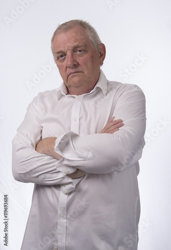 Vertical portrait image of a mature man looking angry and annoyed. Taken on a white background.