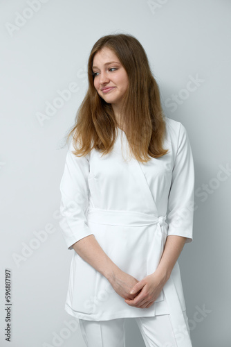 Vertical portrait of healthcare woman doctor, happy medical professional at hospital nurse workplace. Female doctor in white lab coat smiling and looking away against white wall.