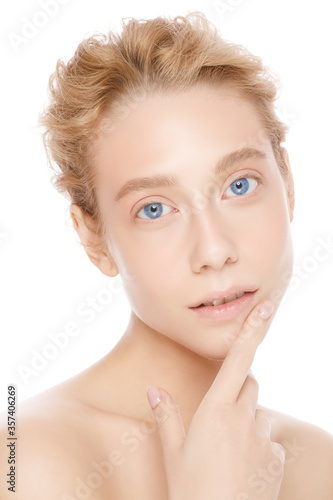 Vertical portrait of young beautiful woman with blond hair and blue eyes, standing with naked shoulders, touching lip with finger, isolated on white background
