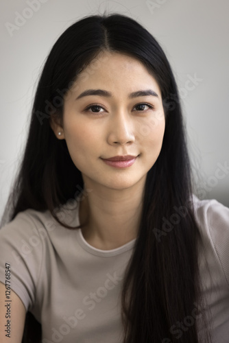 Vertical shot of beautiful Asian woman dressed in casual t-shirt looking at camera with slight smile, exude confidence and calmness while posing alone indoor. Natural beauty, self-care, self-assurance