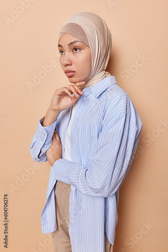 Vertical shot of thougthful Muslim woman wears traditional hijab and formal blue shirt touches chin gently concentrated somewhere ponders on something isolated over brown background. Religion concept