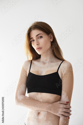 Vertical studio picture of beautiful gorgeous young European female with white patches all over her body because of depigmentation of skin posing isolated, looking at camera with serious expression