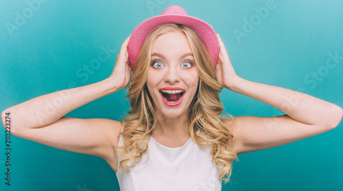 Very exited girl is looking straight forward and holding her pink hat with hands on a head. She is surprised a lot. Isolated on blue background.