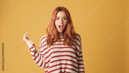 Very surprised girl looking at camera in studio on yellow background