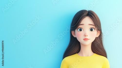 Vibrant 3D render features a young Asian woman in a yellow shirt, her thoughtful expression shining against a light backdrop.