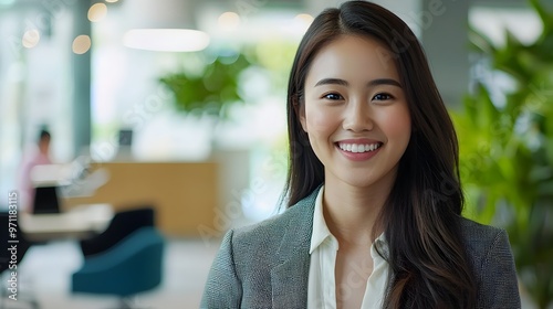 Vibrant Asian Woman Confidently Answering Interview Questions in Office Setting