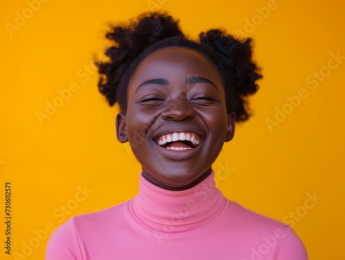 Vibrant image of a cheerful young African women laughing heartily, wearing a pink turtleneck against a vivid yellow backdrop.