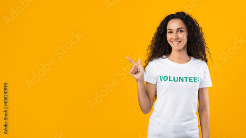 Volunteer Lady Pointing Finger At Free Space, Yellow Background, Panorama