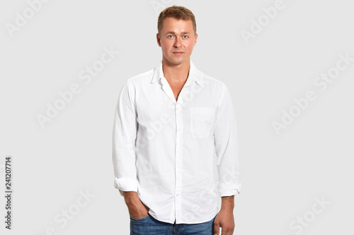 Waist up shot of attractive male entrepreneur wears white shirt and jeans, keeps hand in pocket, isolated over white background. Prosperous young businessman in elegant clothes comes on meeting