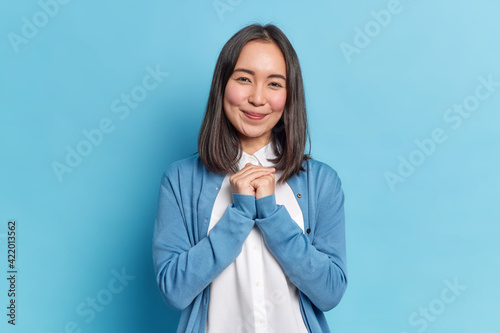 Waist up shot of brunette young Asian woman keeps hands together imagines something with pleased expression wears casual jumper has satisfied expression isolated over blue studio background.