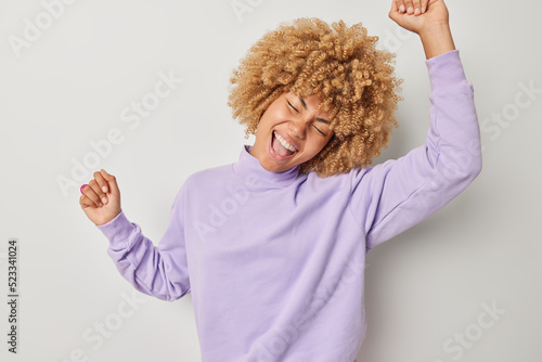 Waist up shot of positive woman with curly blonde hair keeps arms raised up exclaims loudly dances carefree dressed in casual purple jumper isolated over grey background. People and fun concept