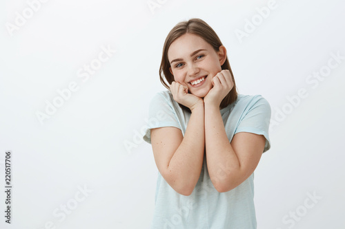 Waist-up shot of cute and gentle european woman loving life leaning head cute on palms and smiling joyfully feeling upbeat and alive posing amused against gray background