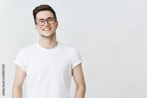 Waist-up shot of pleasant and friendly-looking handsome happy young guy in glasses smiling broadly as standing over gray copy space carefree and joyful living fulfilled life, enjoying conversation