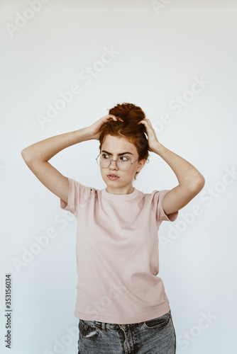 wary look through glasses for sight of a girl with a shock of red thick hair on her head background gray