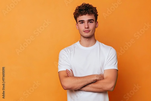 wears t-shirt casual clothes hold hands crossed folded looking camera isolated on plain color background studio portrait. Lifestyle concept, ai