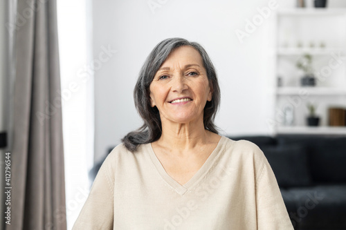 Webcam view of a smiling senior woman looks into the camera, older female teacher look at camera conducts online lesson, webinar. Video meeting with a grey-haired grandmother