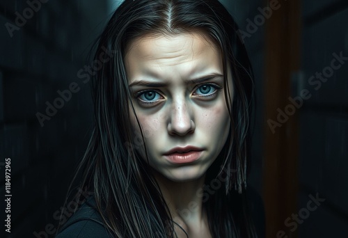 Wet young woman under heavy rain, conveying sadness and loneliness