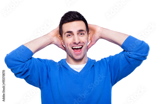 What a surprise! Surprised young man in casual wear holding hands behind head and smiling while standing isolated on white background