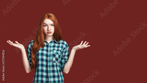 What should I do Bright emotional female portrait. Girl throws up hands with sorry face.